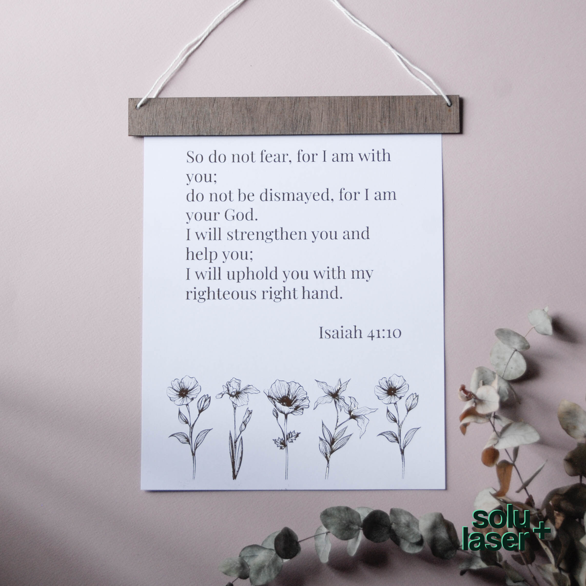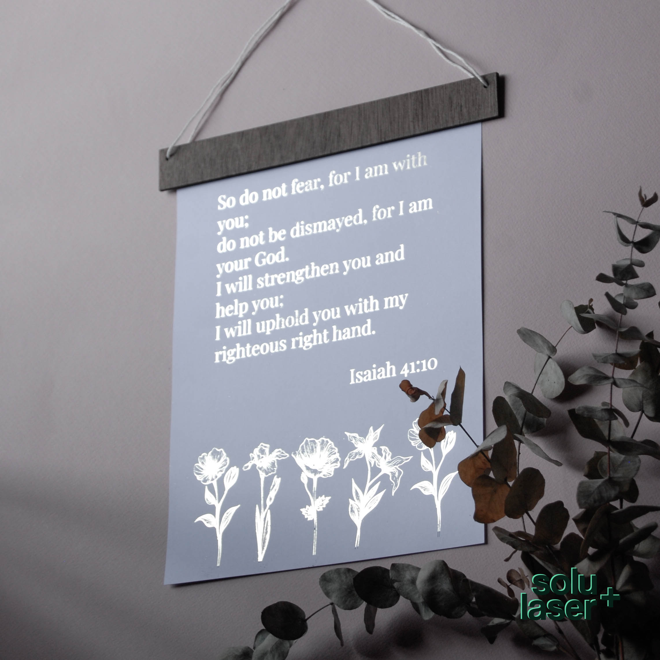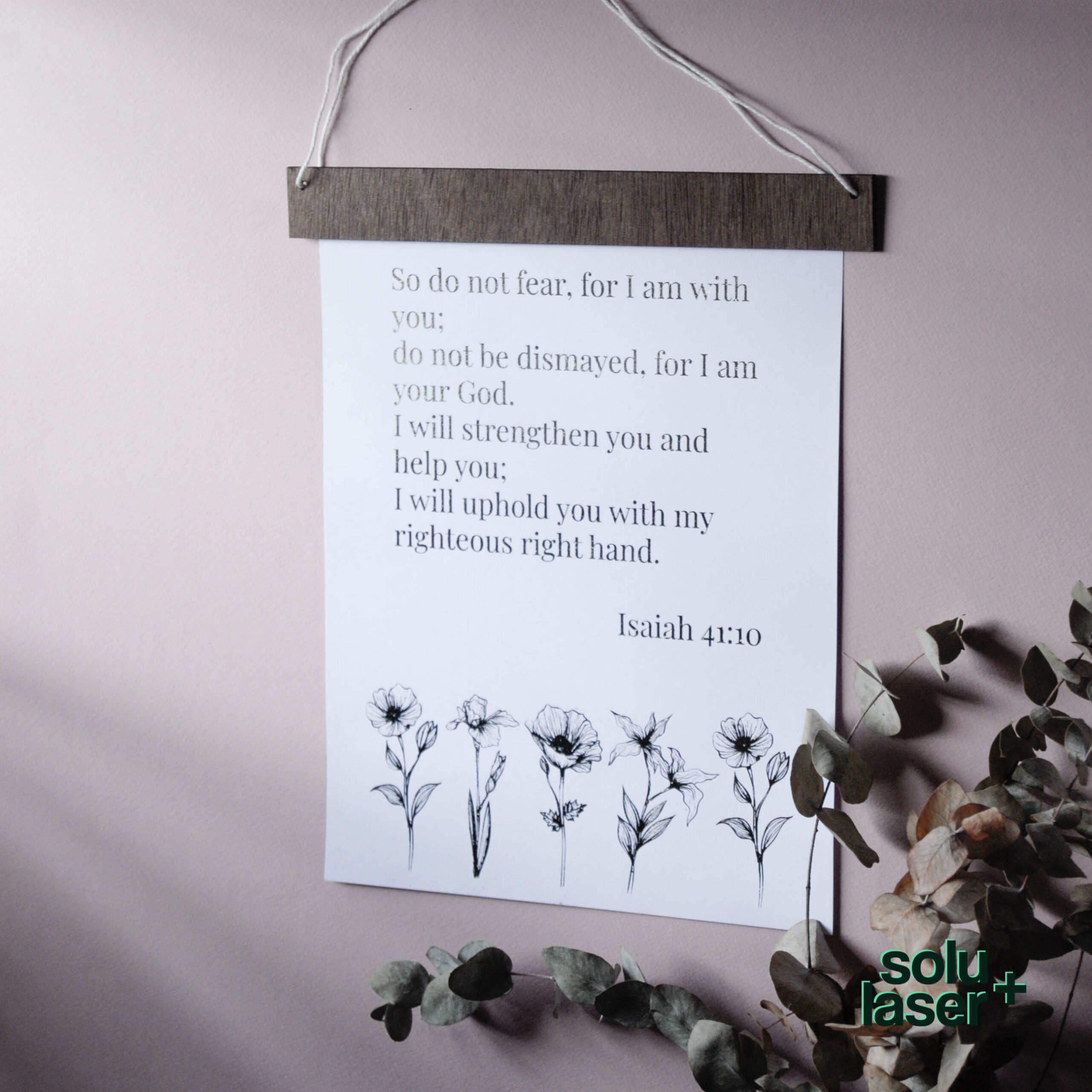 Cuadro tamaño carta con impresión en foil, barra de madera y lazo para colgar.