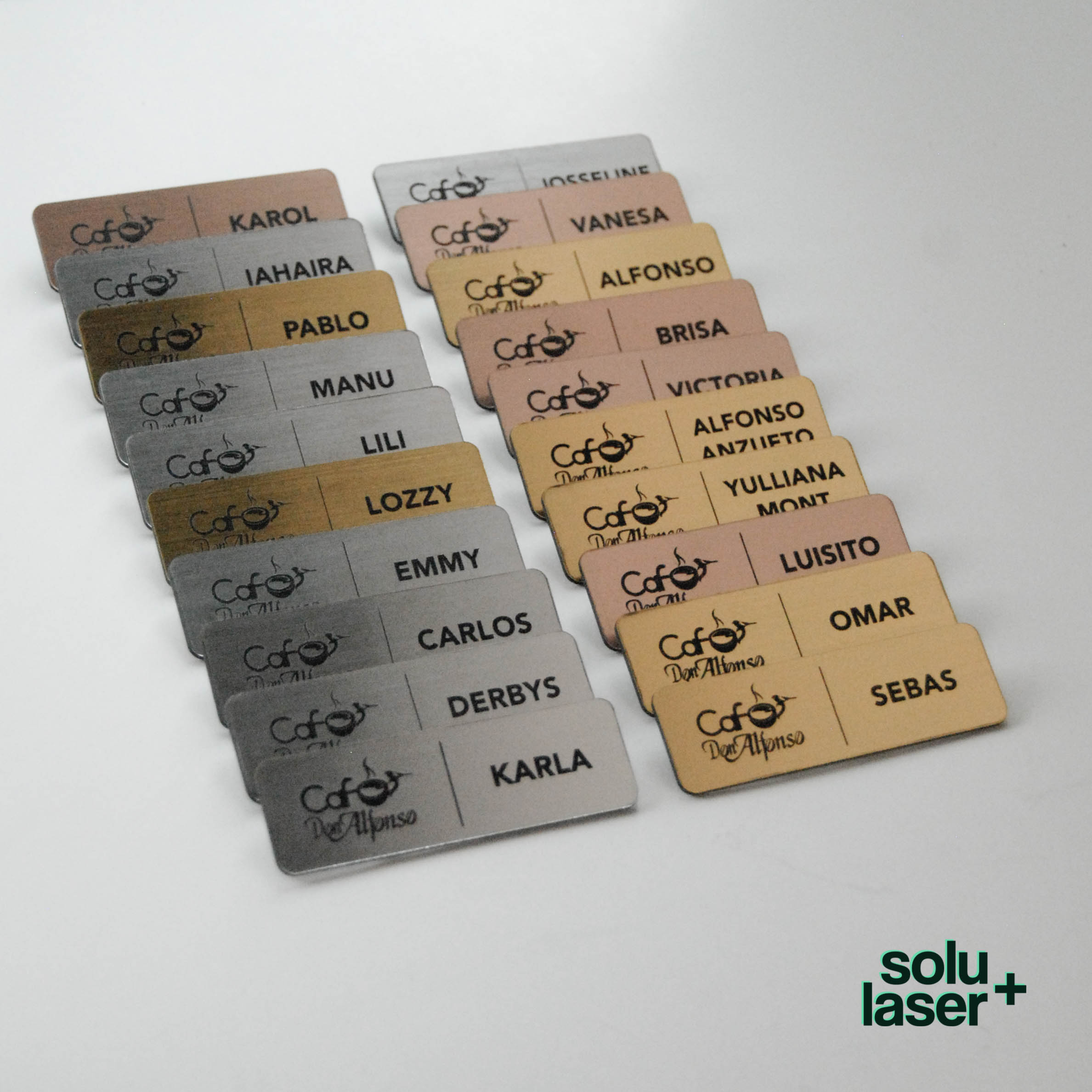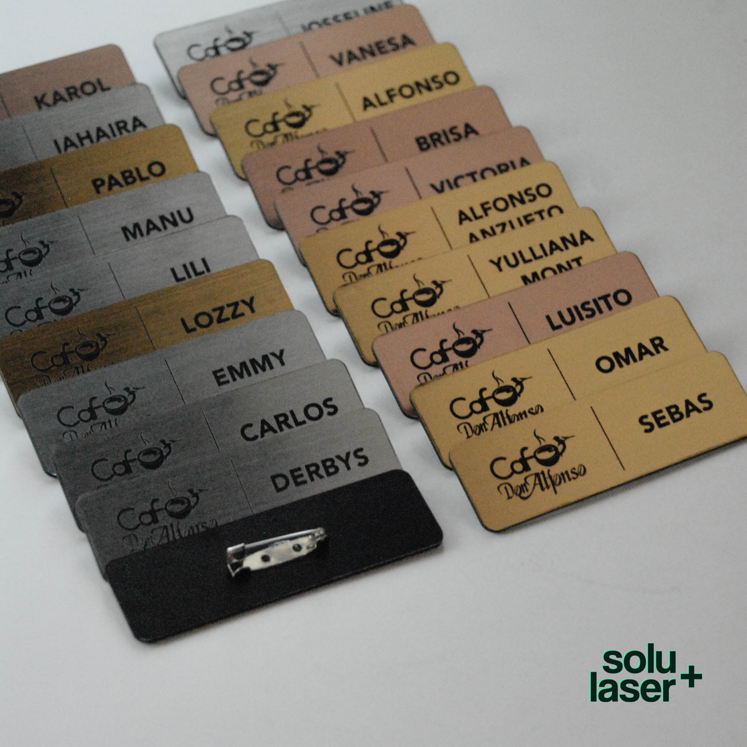 Gafetes de identificación para empresas personalizados con texto, logo y nombres.