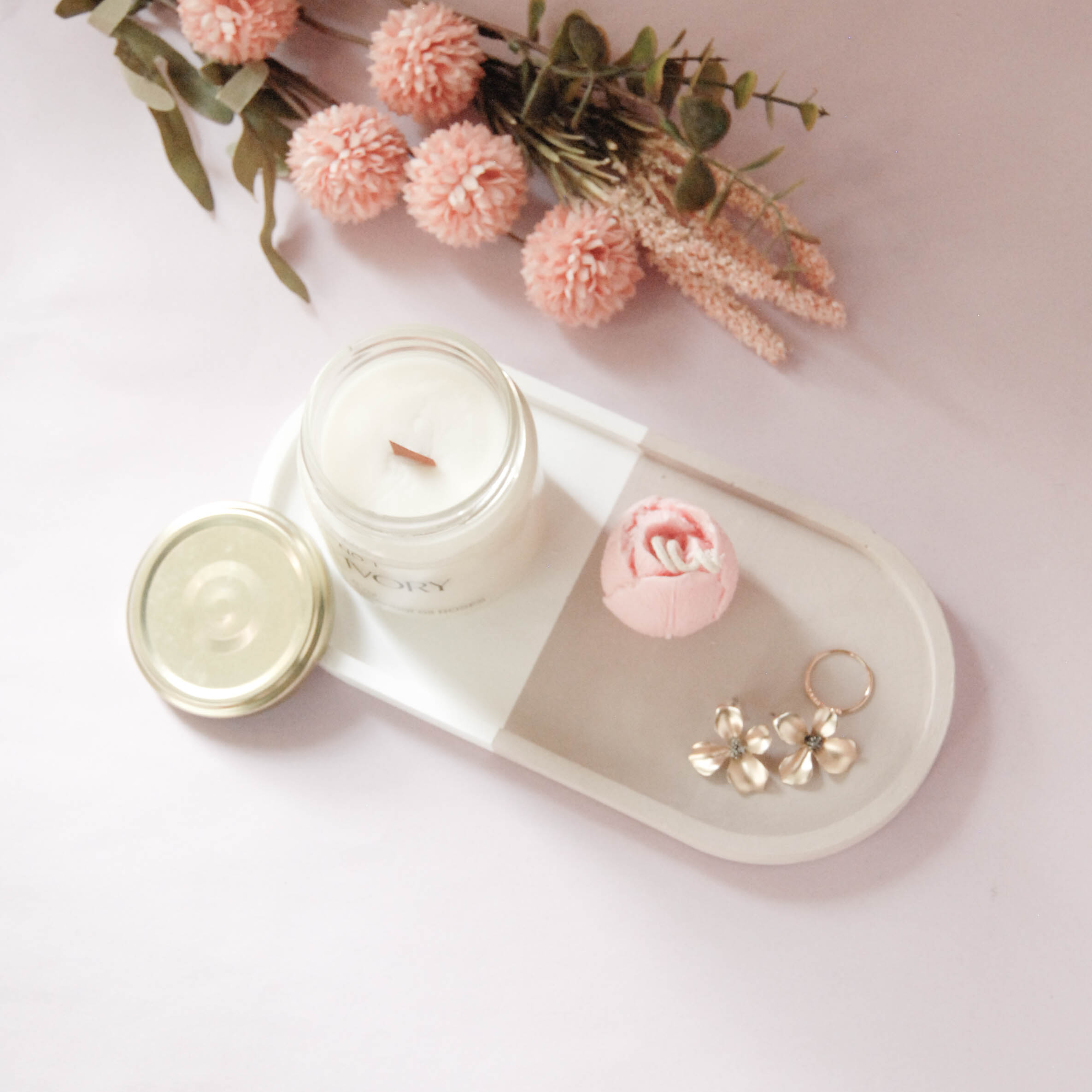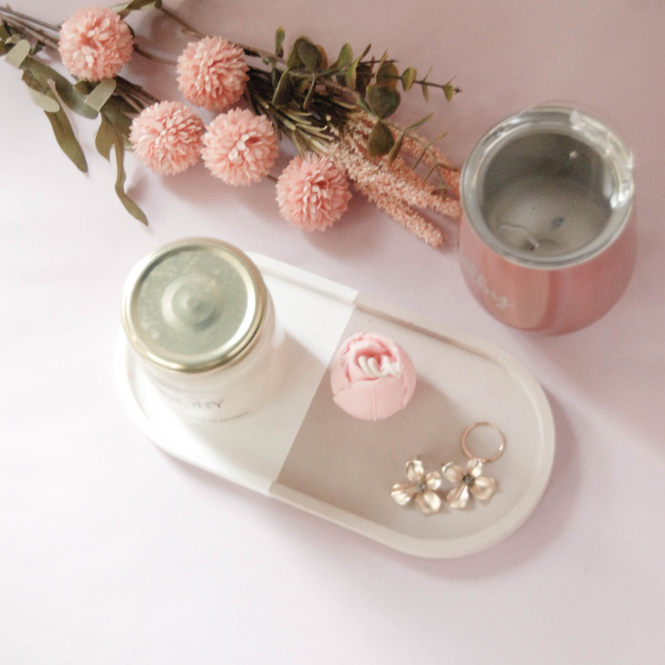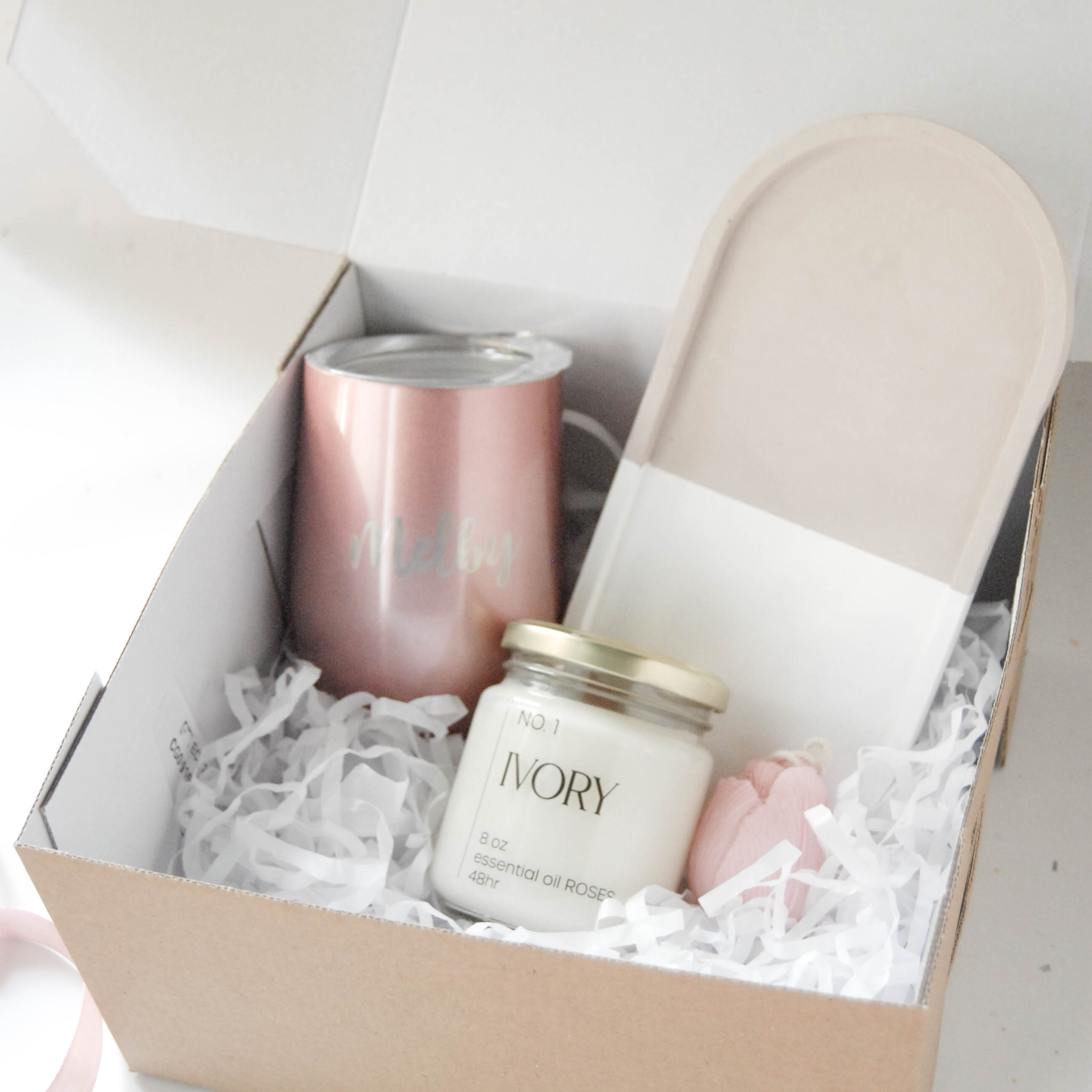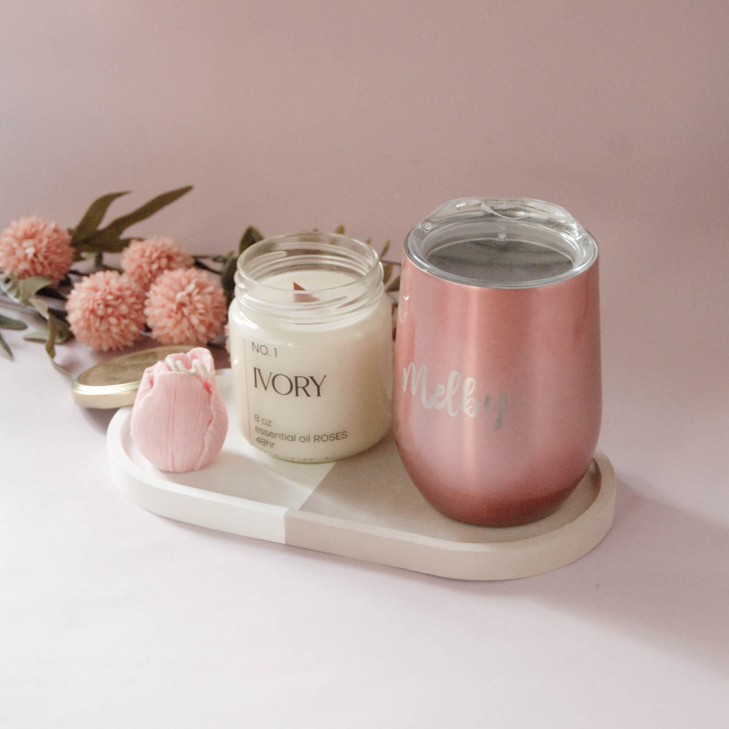 Esta gift box incluye una vela Tulip y un Ivory Jar de @rosalunahome , una bandeja ovalada XL de @flava.gt y un termo personalizado de @solulaser