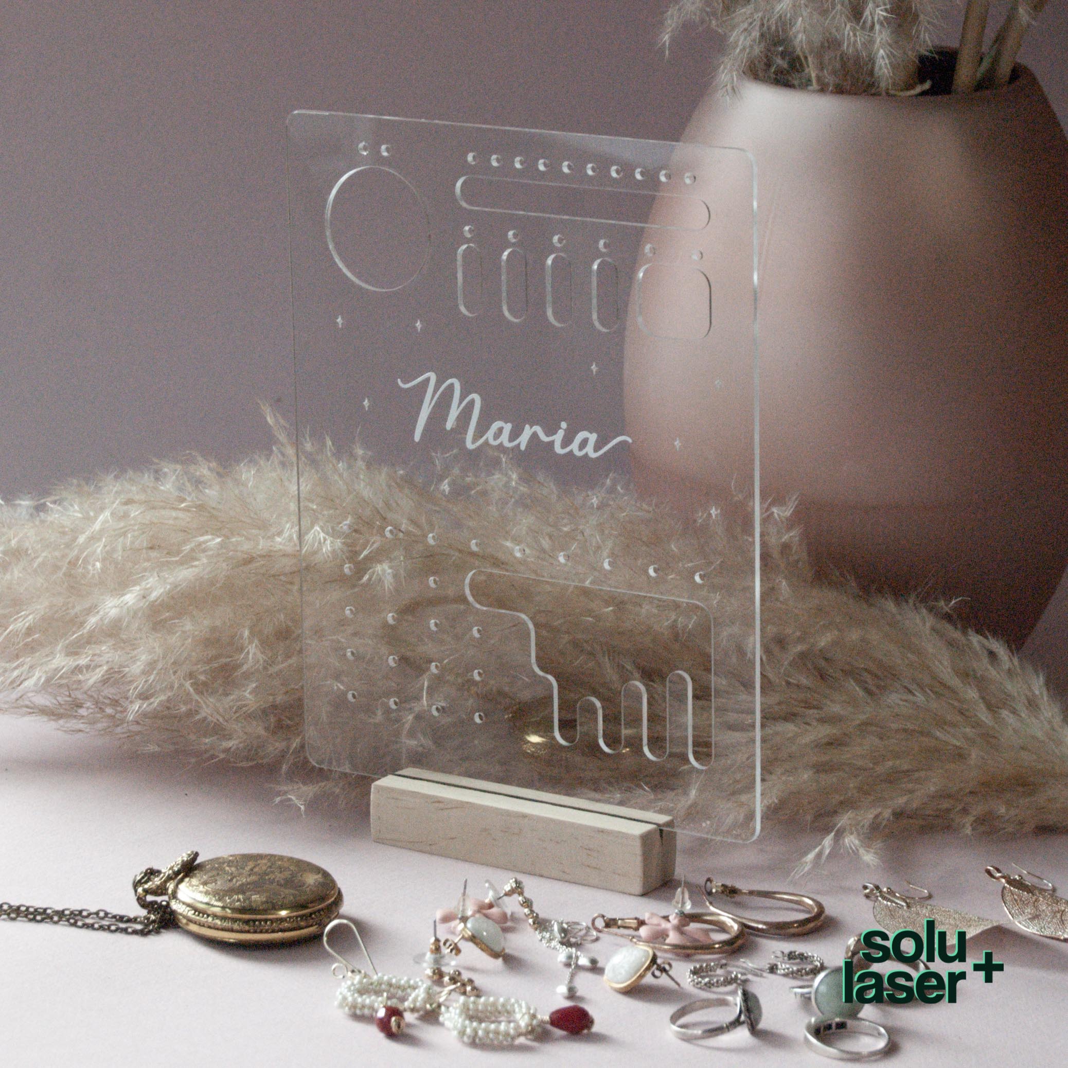 Joyero en acrílico de 19 x 15 cm con base en madera y distintos divisores para colocar aretes, anillos y pulseras. Elige el nombre o texto que desees colocar en vinil adhesivo.
