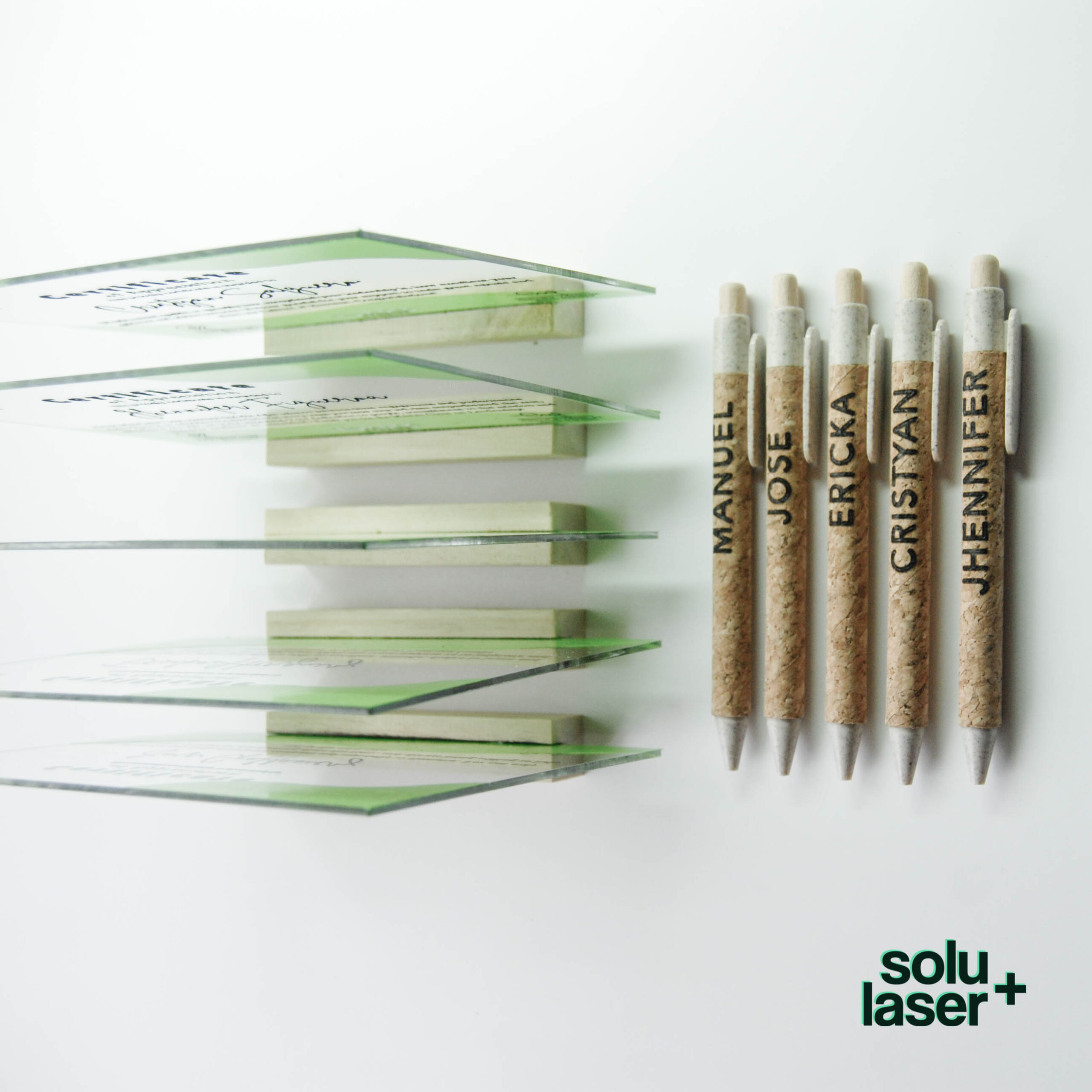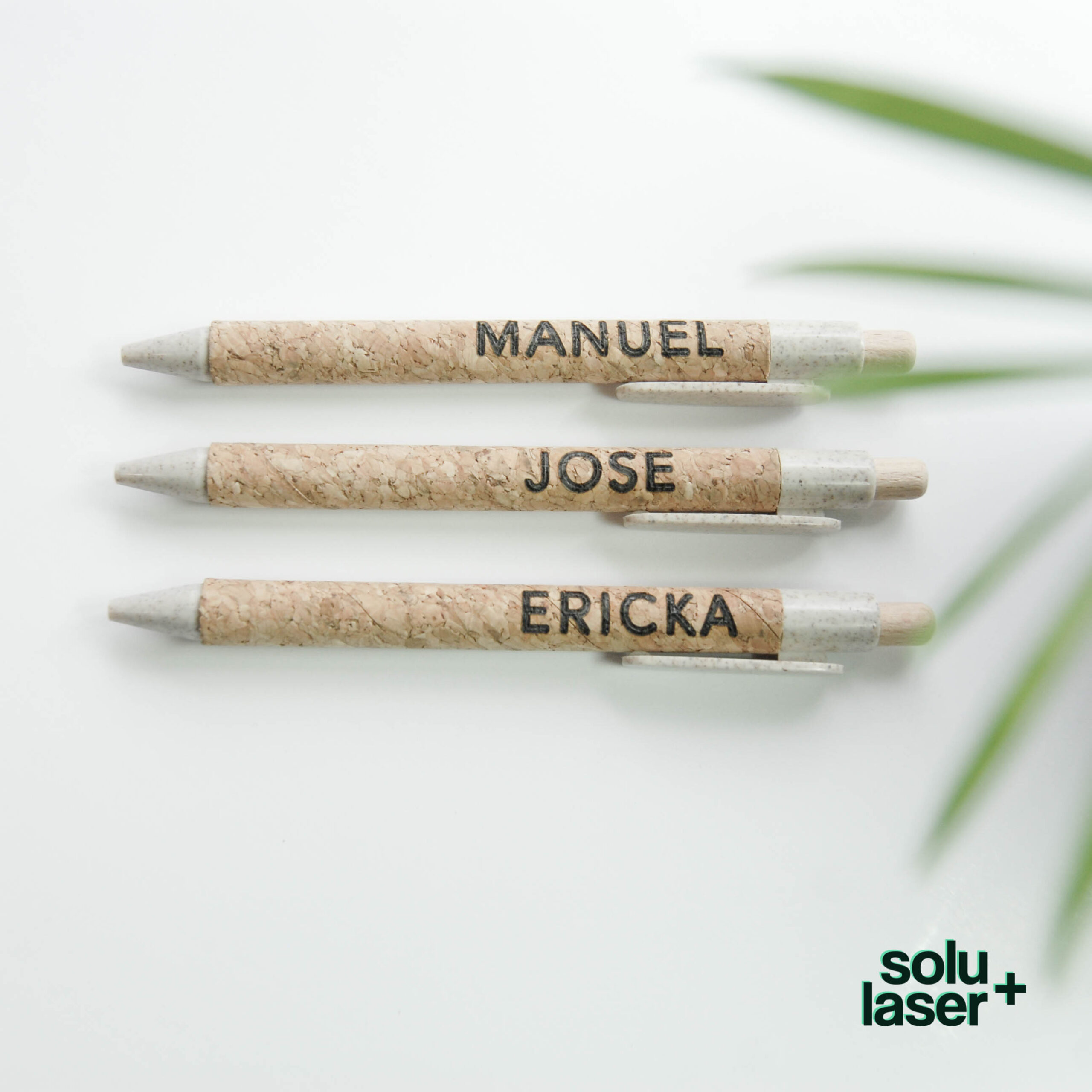 Lapiceros de corcho con nombre o texto grabado.