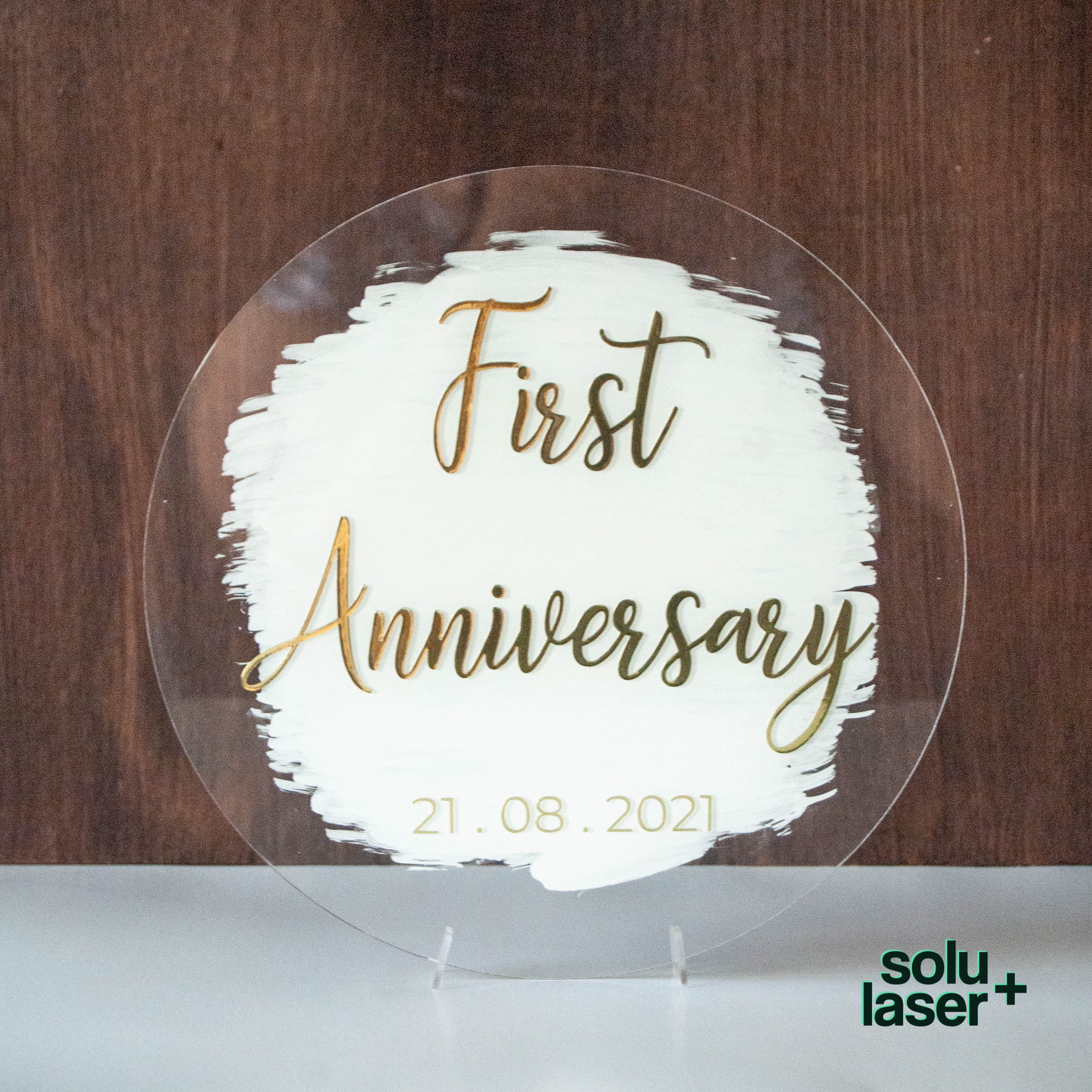Letrero para First Anniversary, en acrílico de 23 cm de díametro.
