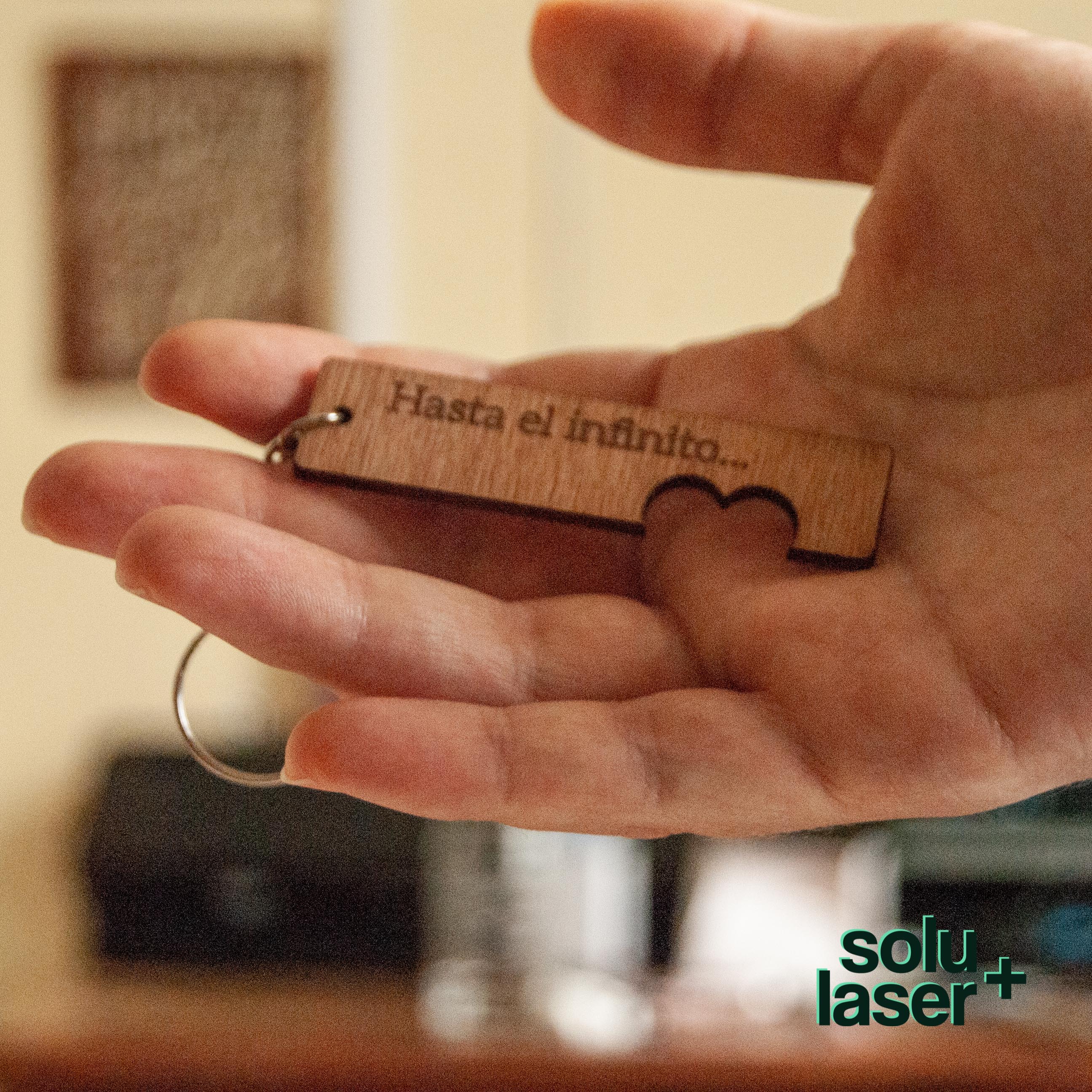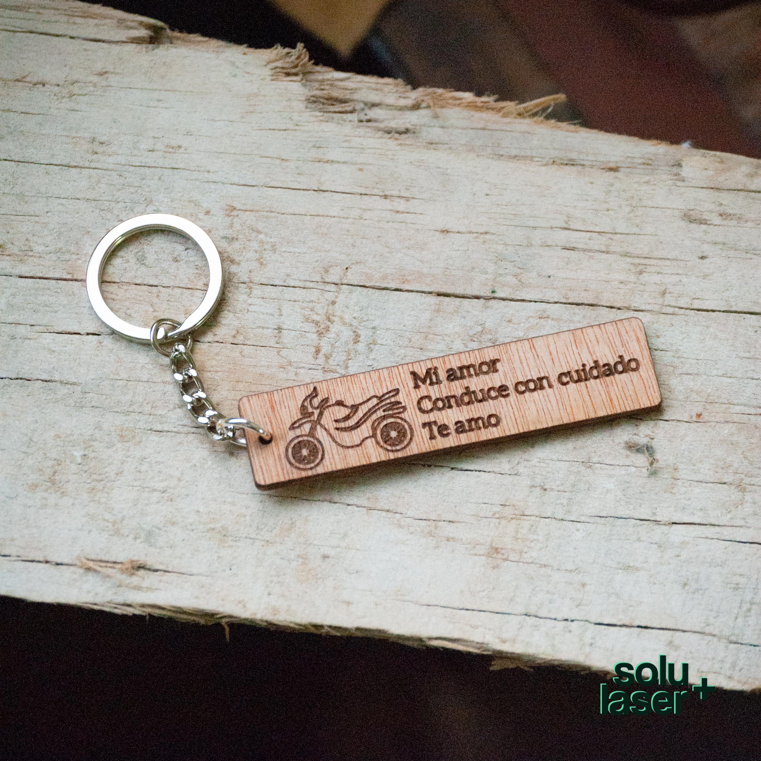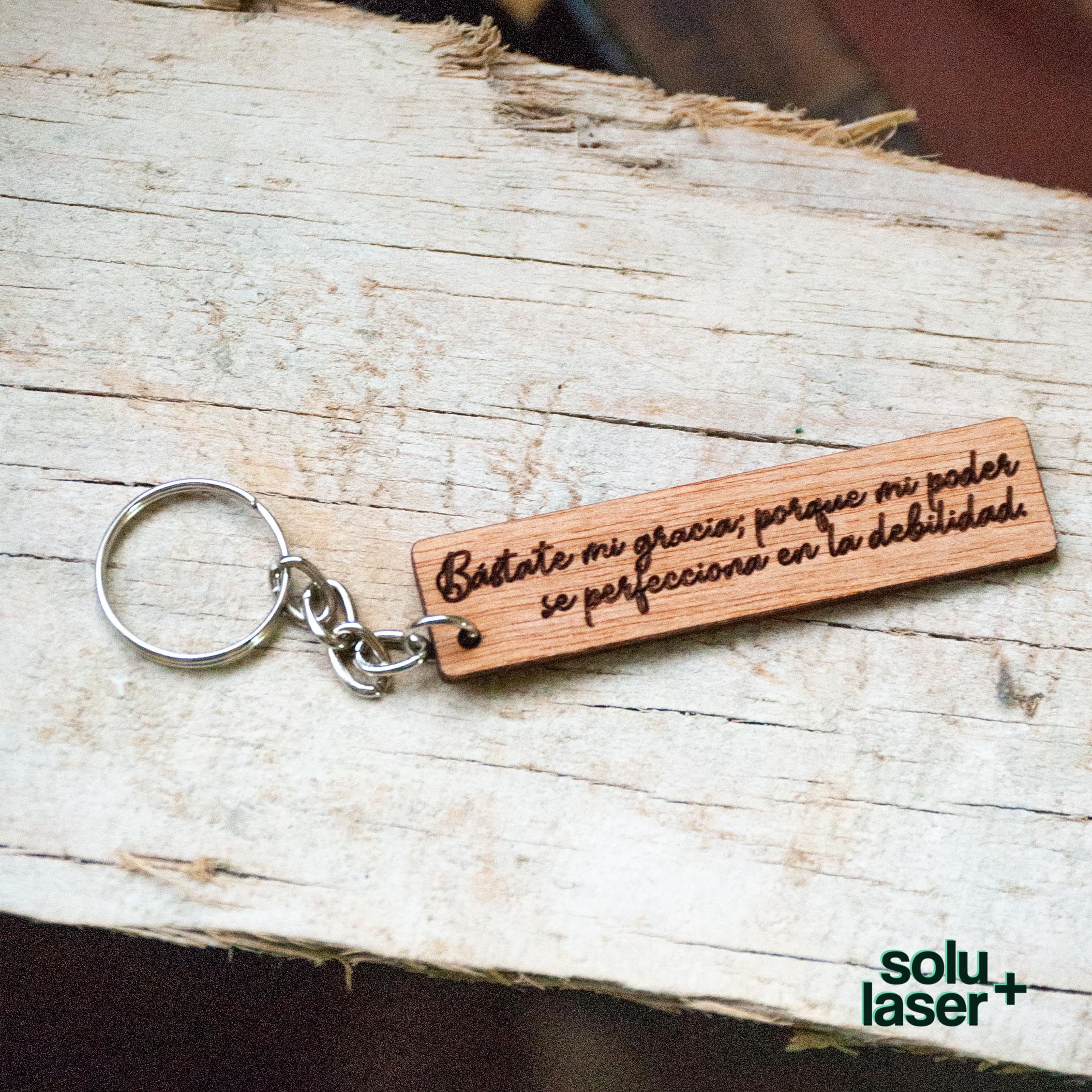 Llaveros rectangulares en madera con texto variado.