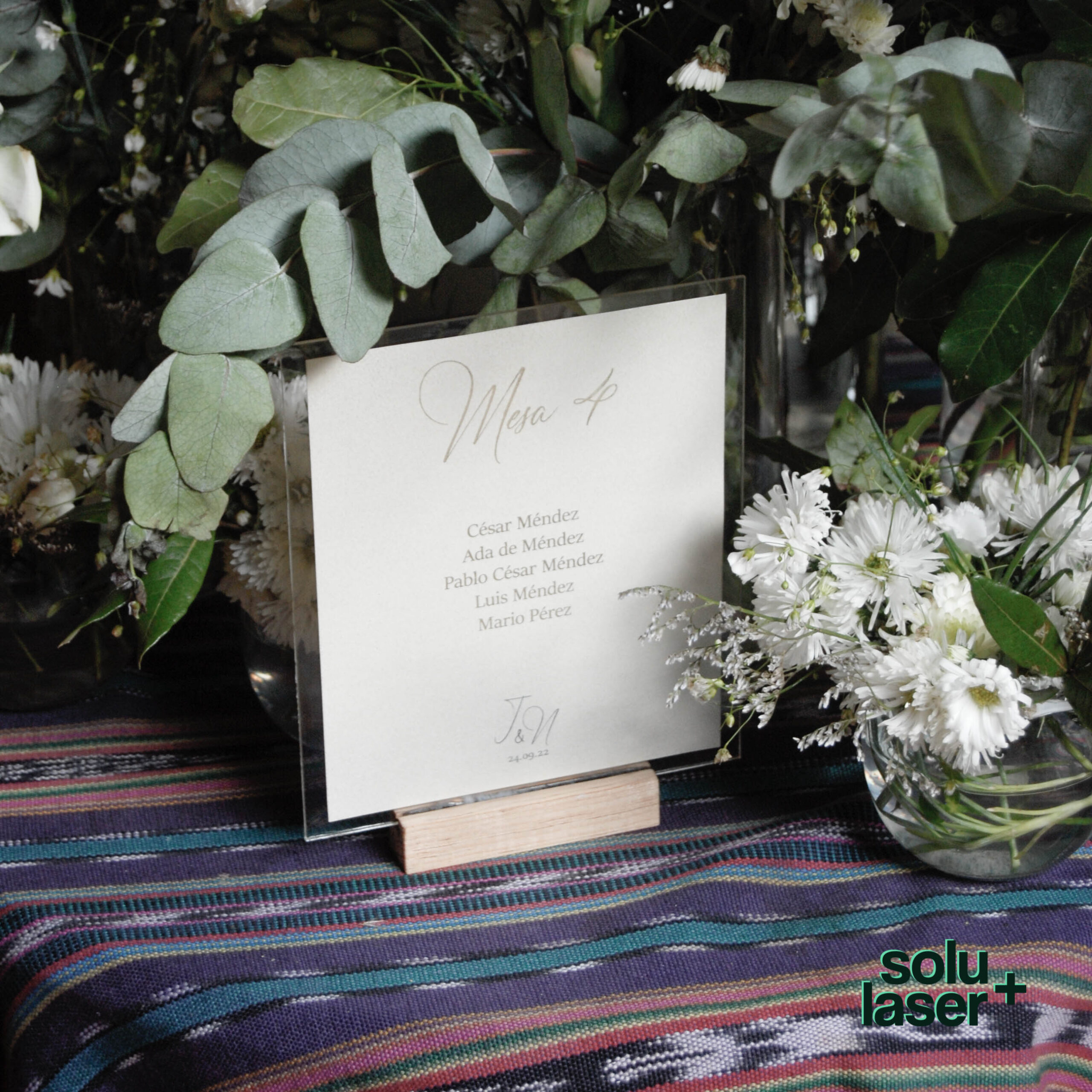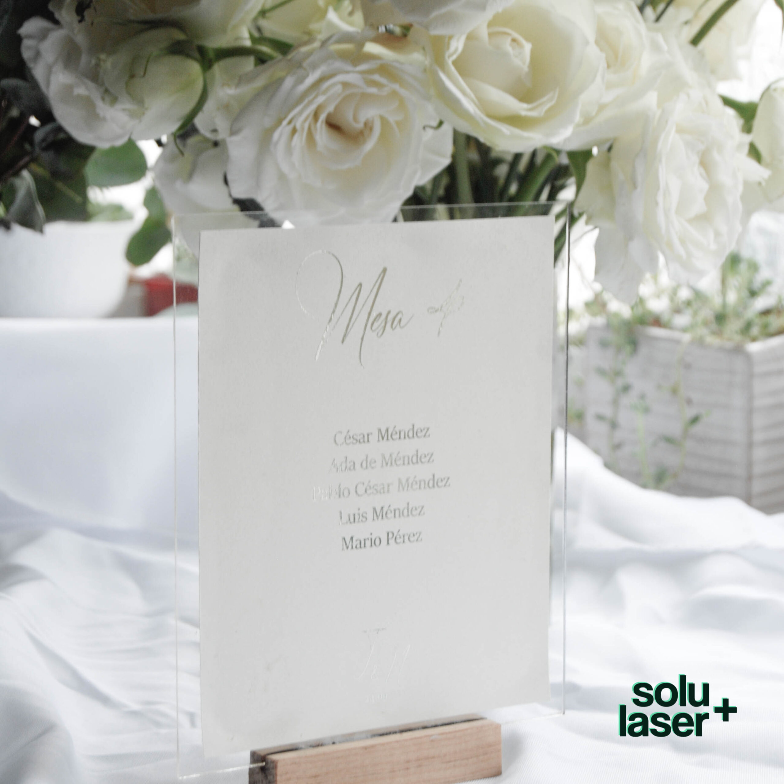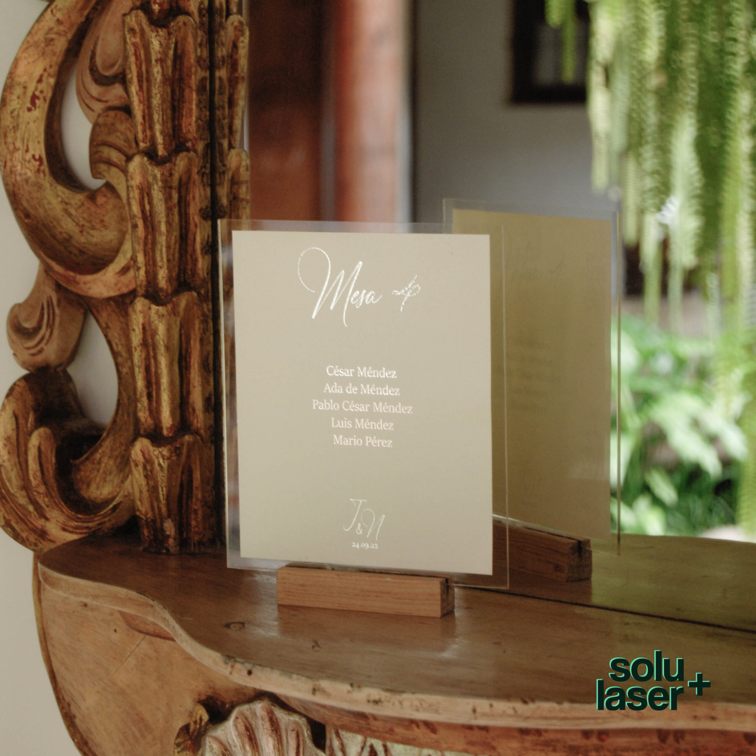 Número de mesa+ seating chart en uno solo! Base de acrílico y madera, con impresión sobre papel nacarado y textos en foil dorado.