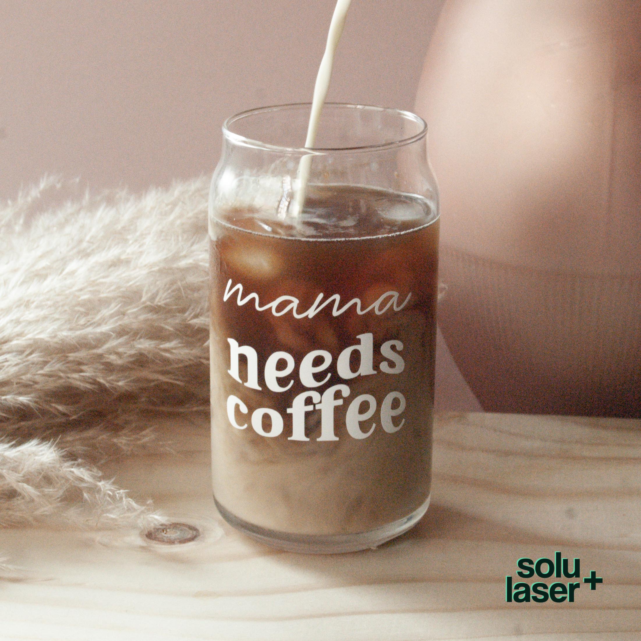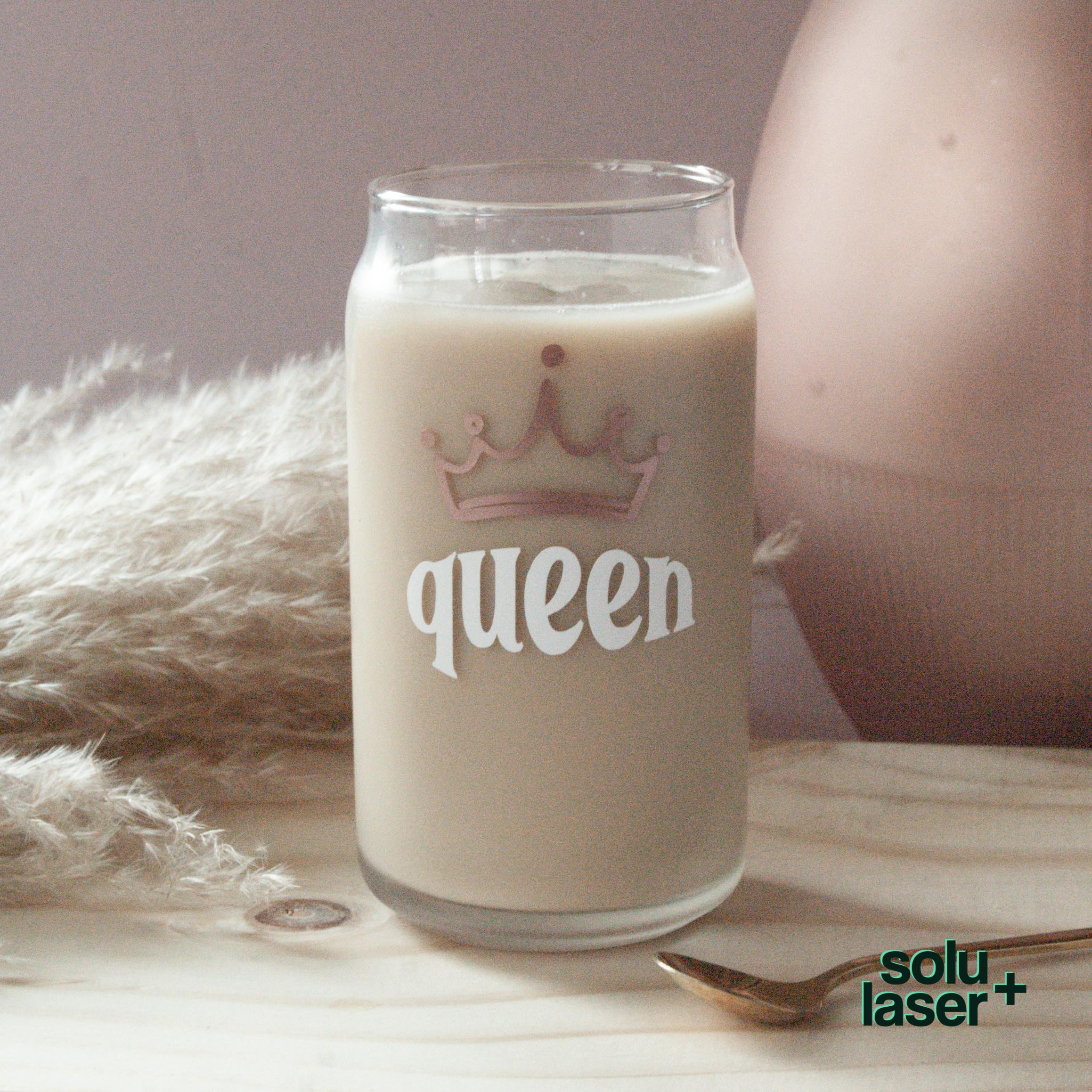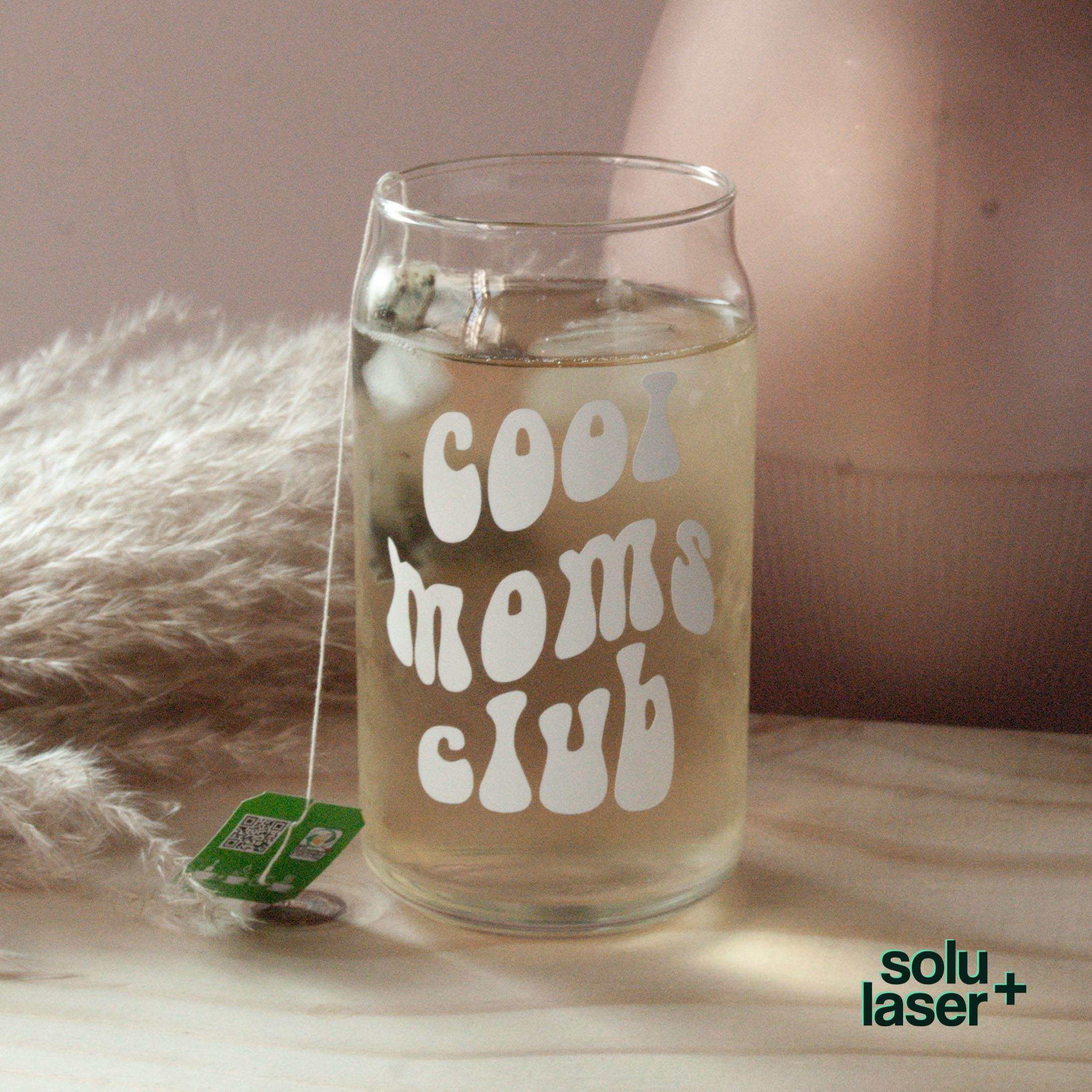 Vaso de vidrio tipo lata, con textos en vinil adhesivo.